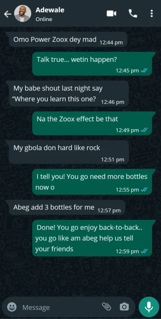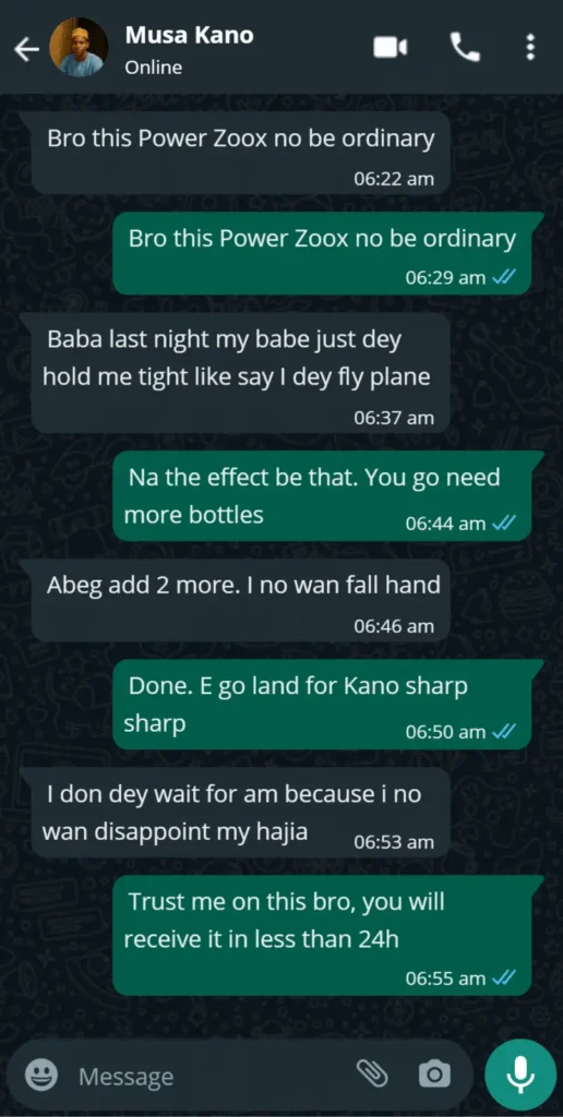 “I used to feel like I wasn’t man enough. Then I took Power Zoox — 3 bottles. Now, I last 20–25 minutes per round, and my size increased visibly. She dey beg me now.”
